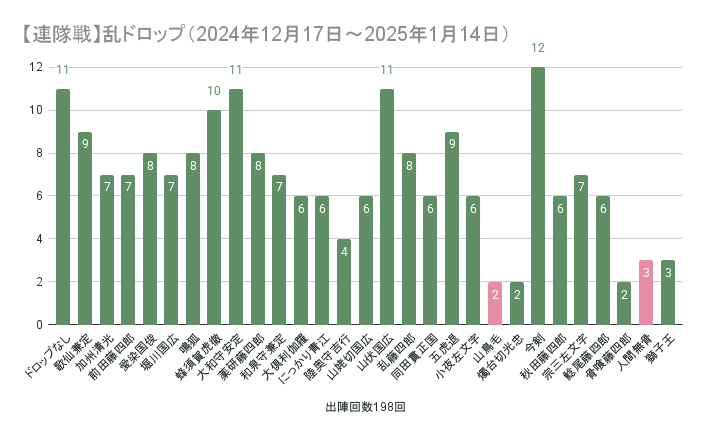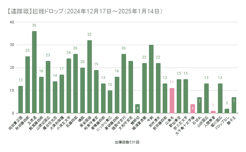 ゲーム #刀剣乱舞 #記録 時間がなくてピンチだった連隊戦だったけど、なんとか30万走りきれて安堵。 これで心置きなく10周年を迎えられる。でも心の準備がまだできていない。 【連隊戦】超難ドロップ(2024年12月17日~2025年1月14日)の集計 【連隊戦】乱ドロップ(2024年12月17日~2025年1月14日)の集計