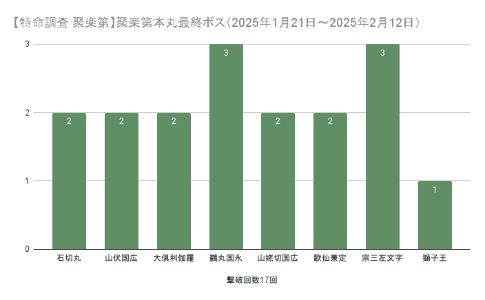 ゲーム #刀剣乱舞 #記録 最終ボス17回撃破して長義くん0振り。 18回目撃破がギリギリ行けそうだったので粘ってみたら、ギリギリ1マス足りなくて目前で撤退する羽目になったよ。 【特命調査 聚楽第】聚楽第本丸最終ボス(2025年1月21日~2025年2月12日)の集計