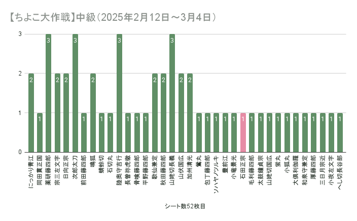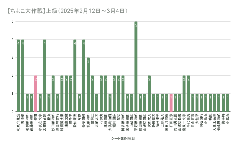 ゲーム #刀剣乱舞 #記録 石田くんと笹貫さんは最大まで来てくれたけど、雲生さんと雲次さんとはご縁がなかった。 特命調査では一切姿を見せなかった長義くんがそこそこ来てくれて不思議な気分。 【ちよこ大作戦】初級(2025年2月12日~3月4日)の集計 【ちよこ大作戦】中級(2025年2月12日~3月4日)の集計 【ちよこ大作戦】上級(2025年2月12日~3月4日)の集計