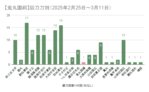 ゲーム #刀剣乱舞 #記録 毎日10連1回だけ鍛刀して鬼丸さん1振り。 祝装+新景趣のガーデンで吹き飛んでいたけど、極鬼丸さんちょっと幼くなった?表情が柔らかくなったからそう見えるだけかな。 【鬼丸国綱】鍛刀刀剣(2025年2月25日~3月11日)の集計