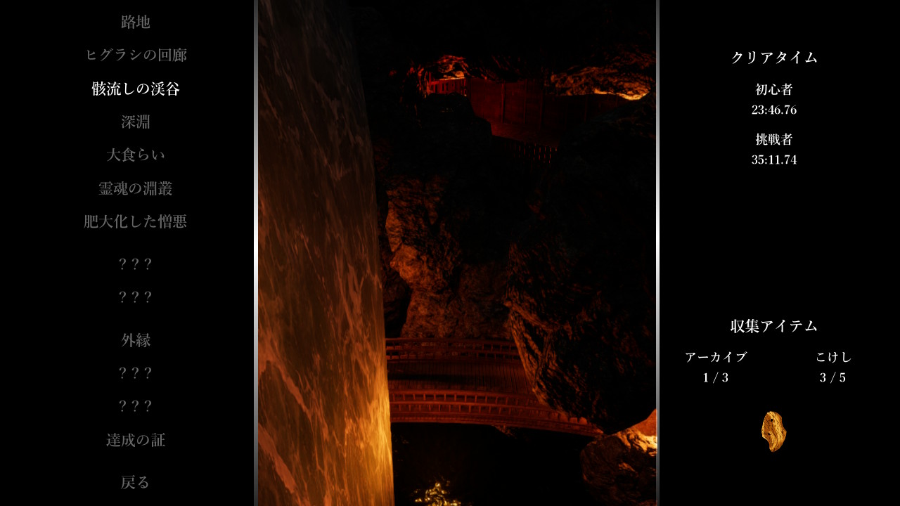 ゲーム #ShadowCorridor 怖くて手をつけられなかった躯流しの渓谷の大勾玉取れたー!でもまだアーカイブとこけしが残っている 大勾玉はあと残り霊魂の淵叢だけになったけど、初心者モードでクリアタイム104分ぐらい掛かっていると取れる気しないよね。 躯流しの渓谷の大勾玉