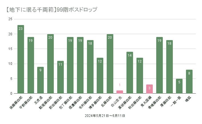 ゲーム #刀剣乱舞 #記録 地下99階250回周回の集計結果。 博多くん12振り、後藤くん23振り、信濃くんと包丁くんは19振り、毛利くんと厚くん18振り、白山くん1振り、鬼丸さん3振り 大阪城地下99階(2024年5月21日~6月11日)のボスドロップ集計 今更だけど、今後の予定に自動行軍機能があってびっくりした。 とうらぶがどんどん便利で遊びやすくなっていく。